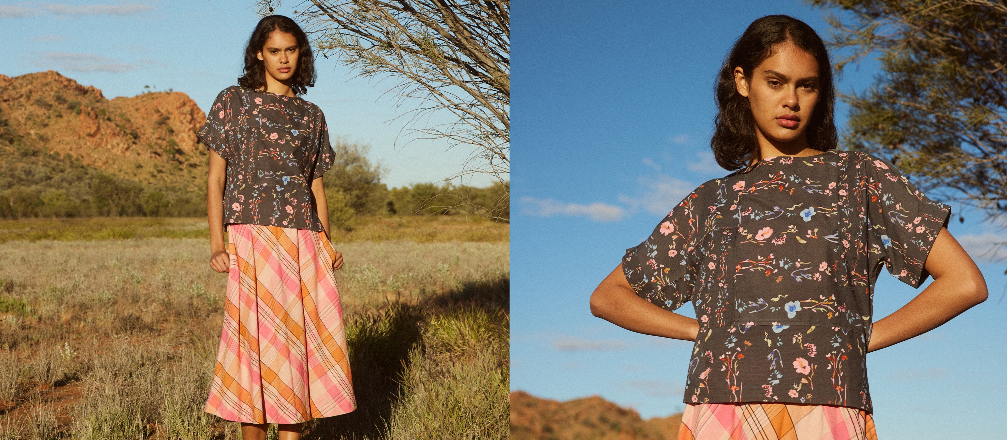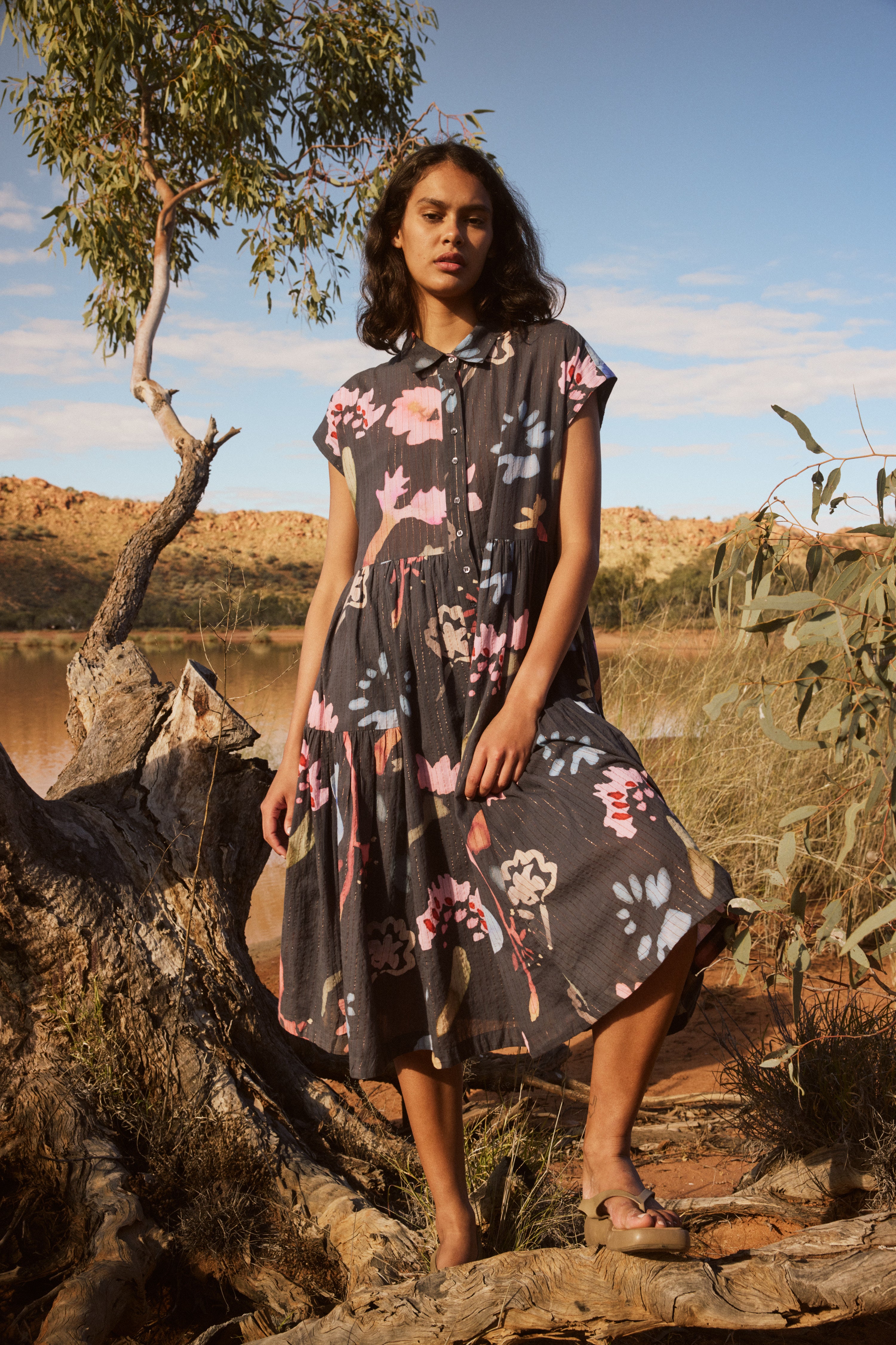 This season’s Iridescence collection was captured in Mparntwe / Alice Springs on Arrernte Country, where vast skies and shifting light became the backdrop to our story. Photographed by Stephanie Cammarano at the Clay Pans, the collection reflects a spirit of travel, ease, and beauty in the everyday. Emily shares moments from the trip, full moons over the MacDonnell Ranges, her philosophy on packing lightly, and the Nancybird bags she never leaves behind.