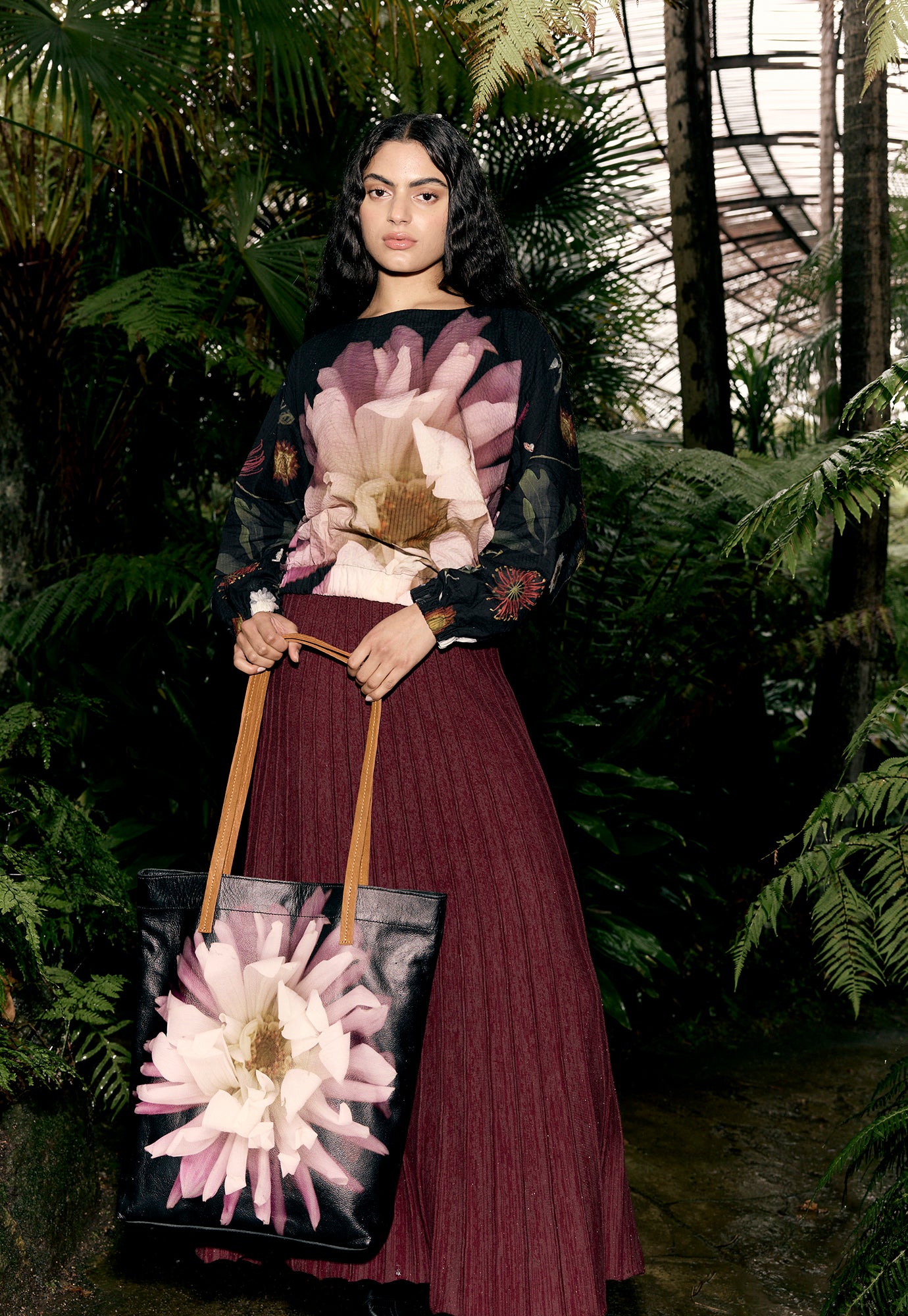 I think the different ways we’ve utilised this print shows the variety of ways you can wear it – a big bold dahlia centrally placed on a tee, or a hazy floral that becomes more about the colour mix. A black base especially in the cooler months works with everyone’s existing wardrobe too!