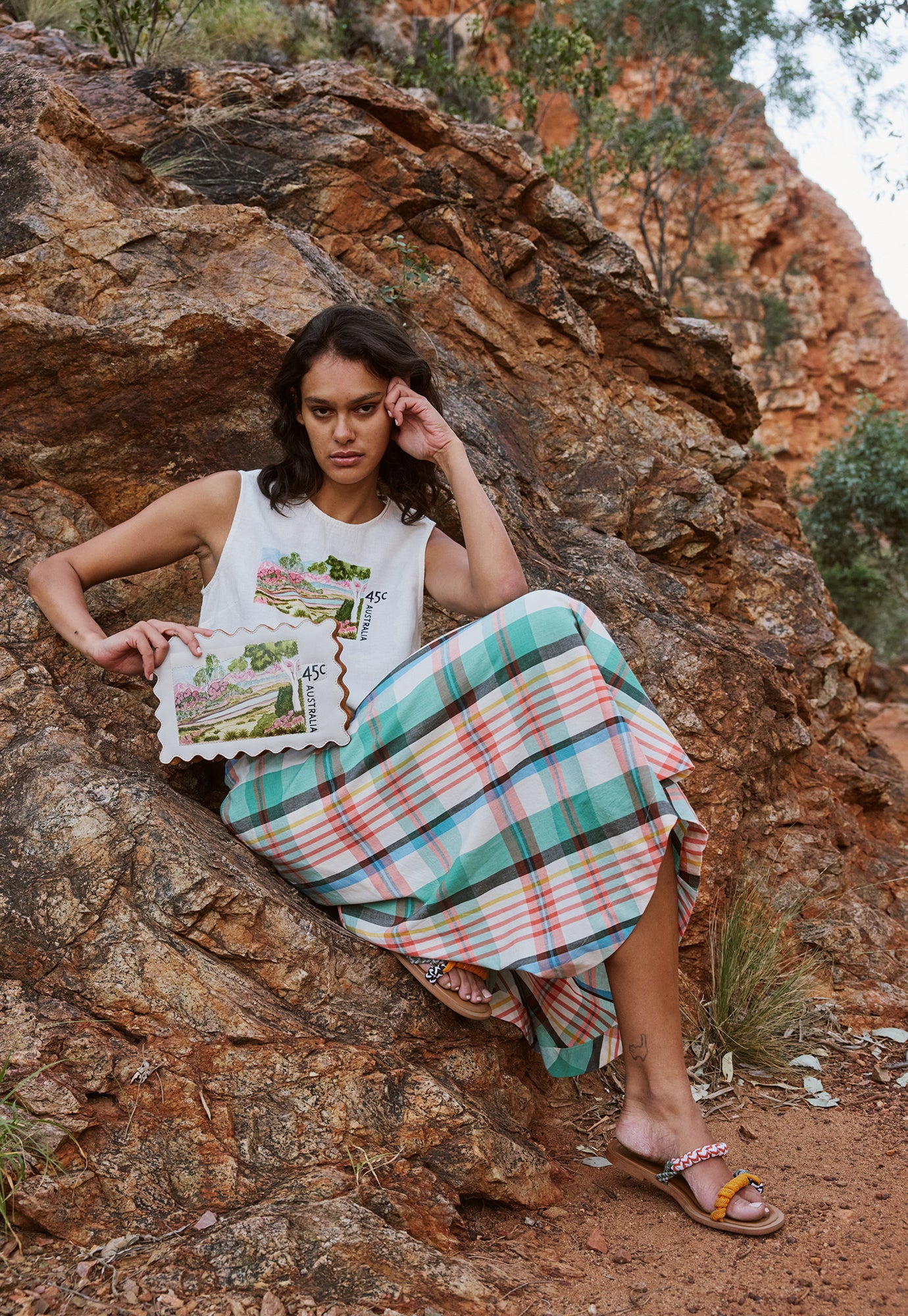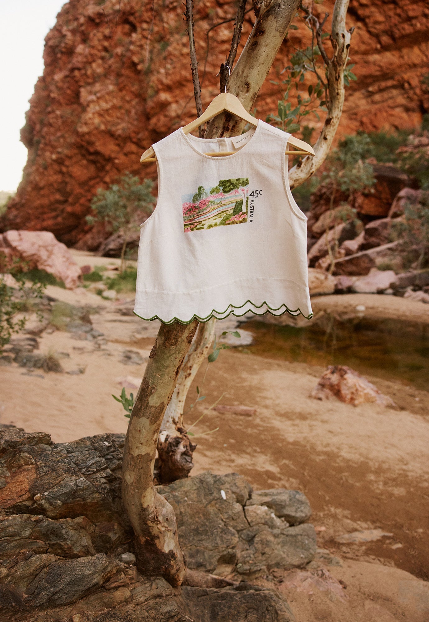 Selma's Postage Stamp artwork brings a joyful, graphic rhythm to the capsule, with a standout Stamp Clutch - it's scalloped edges echoing the artwork’s original postcard form - a playful nod to Selma’s vibrant composition. Complemented by soft summer pieces including a linen scalloped tank, cotton tee and canvas tote, these designs offer a unique and meaningful touch to our wardrobes this season.