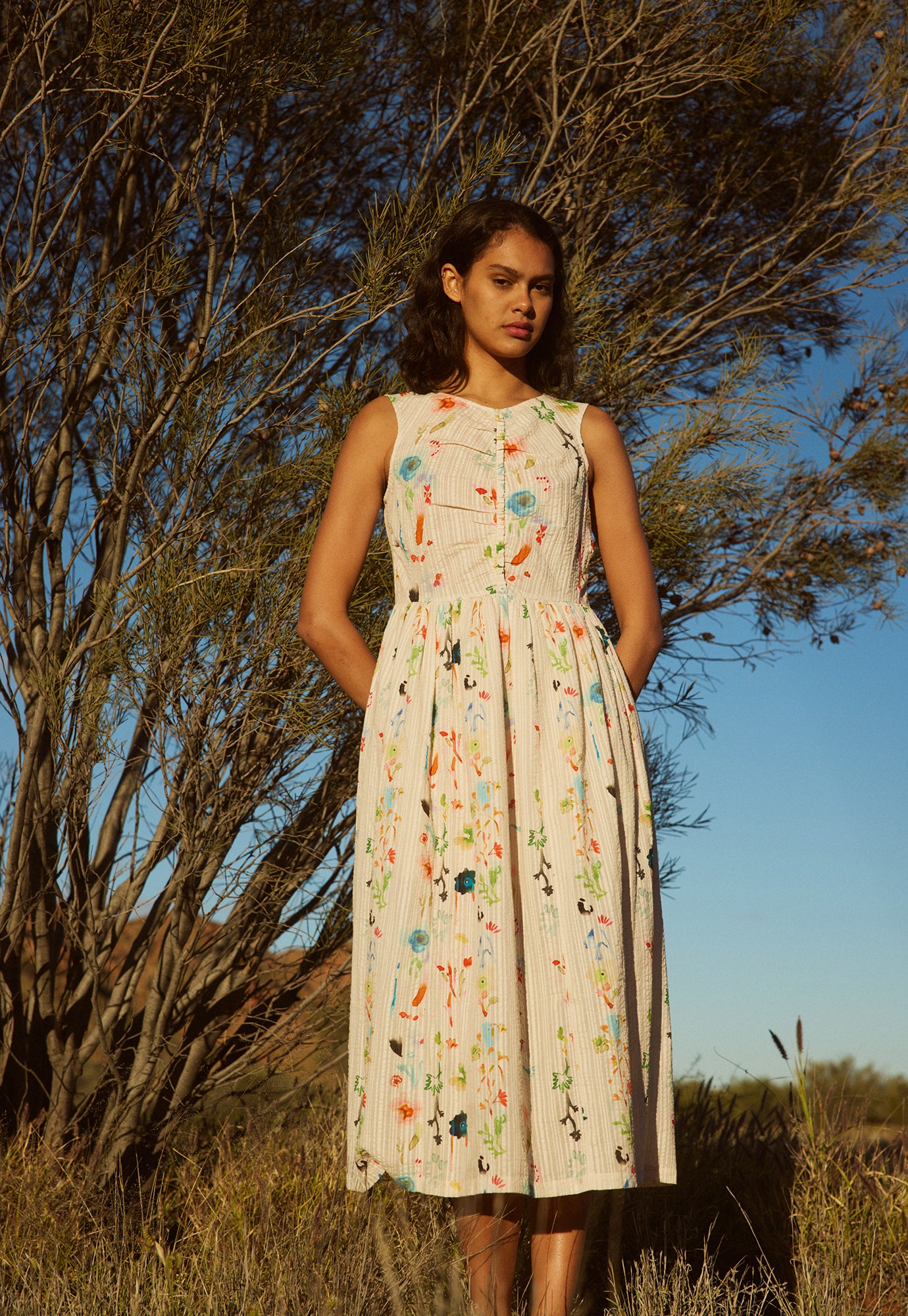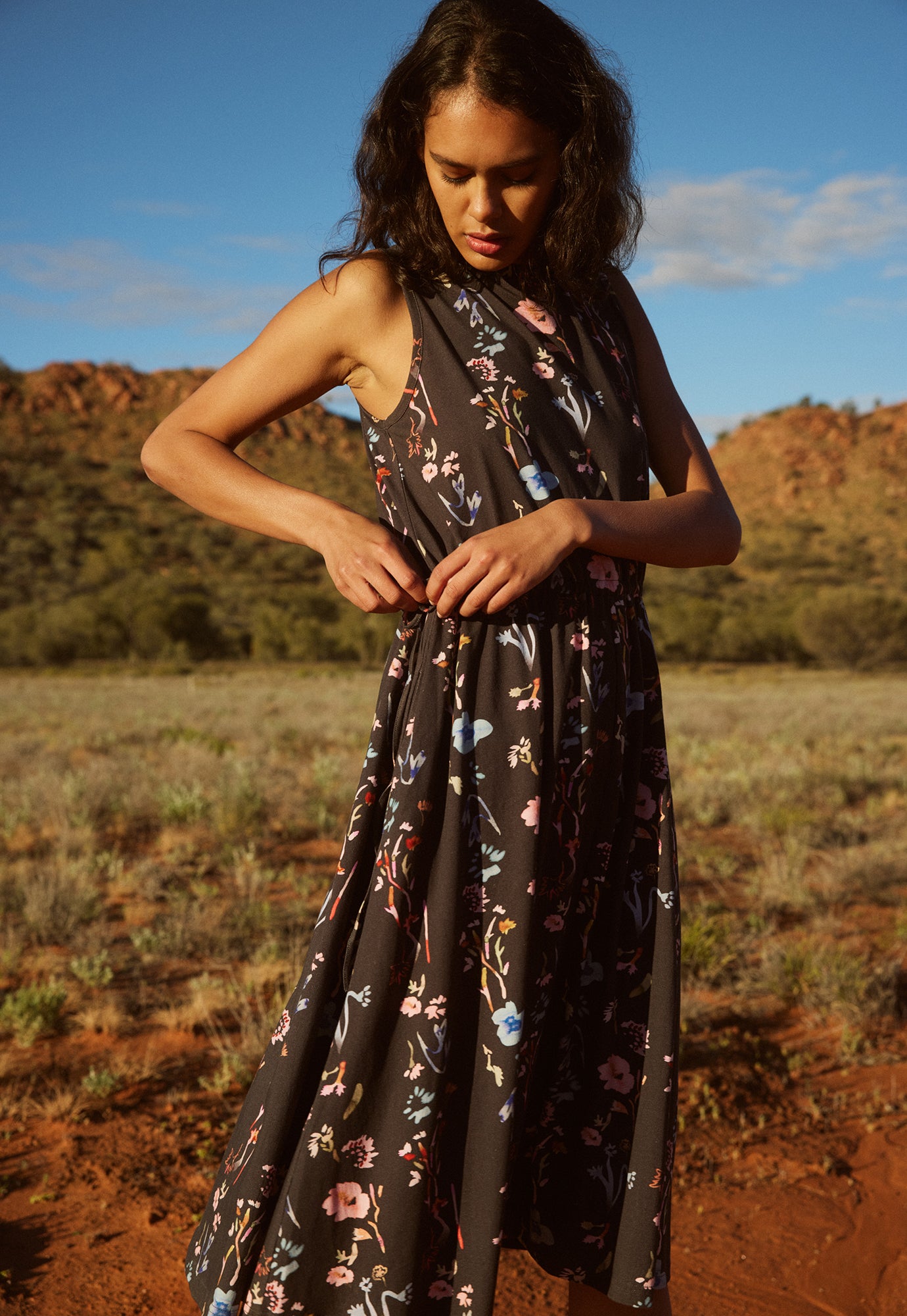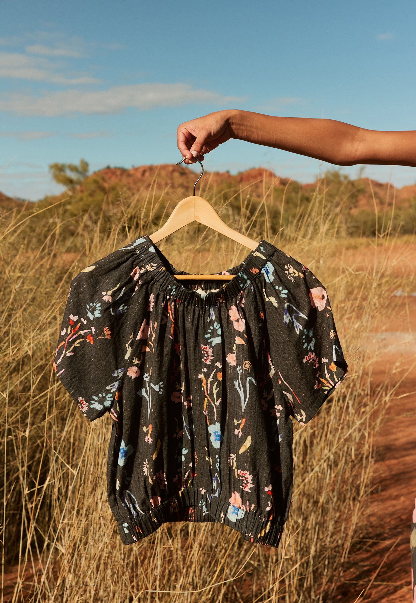 This season, our founder Emily and team travelled to Mparntwe / Alice Springs, Arrernte Country, where the vast skies, shifting light and raw beauty of the landscape became the perfect backdrop for our Iridescence collection. Shot by photographer Stephanie Cammarano at the Clay Pans just outside of town, the story of this place weaves into the garments themselves, pieces designed for travel, for ease, and for finding beauty in the everyday.