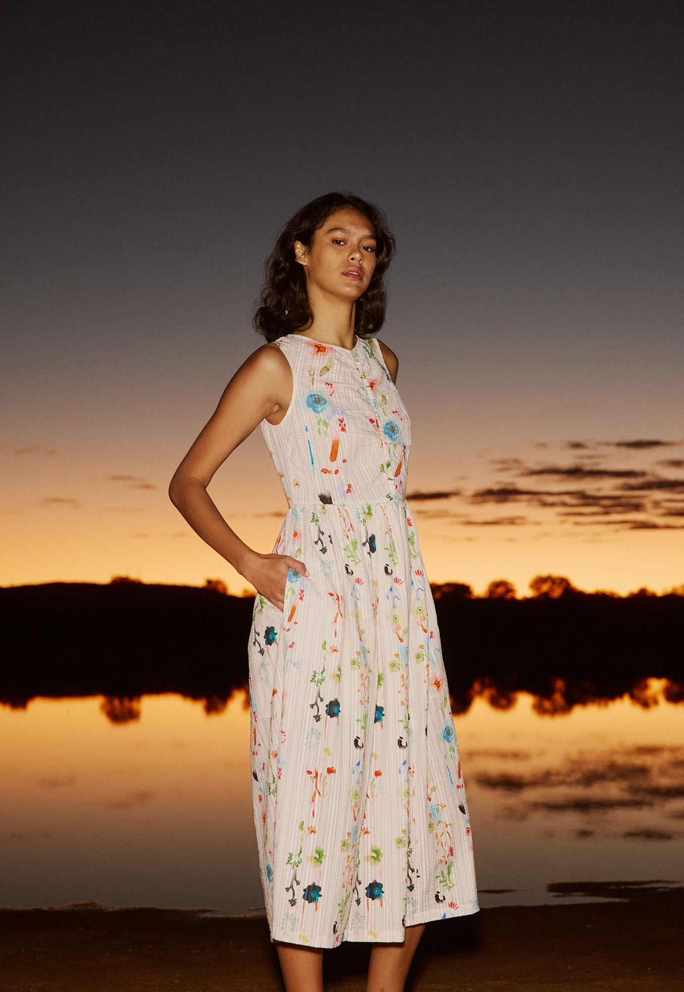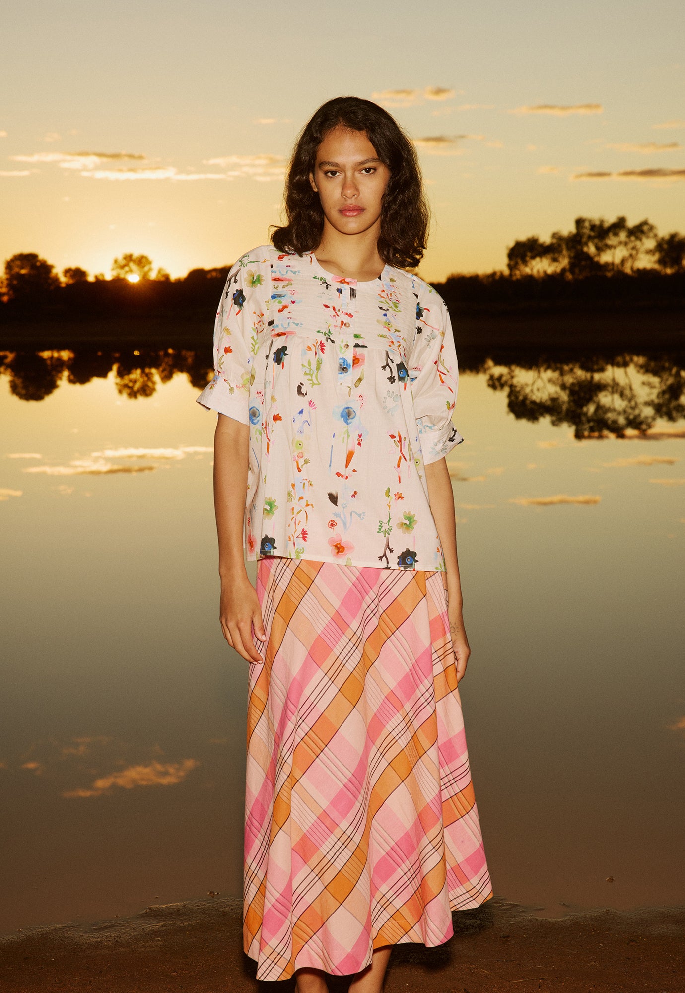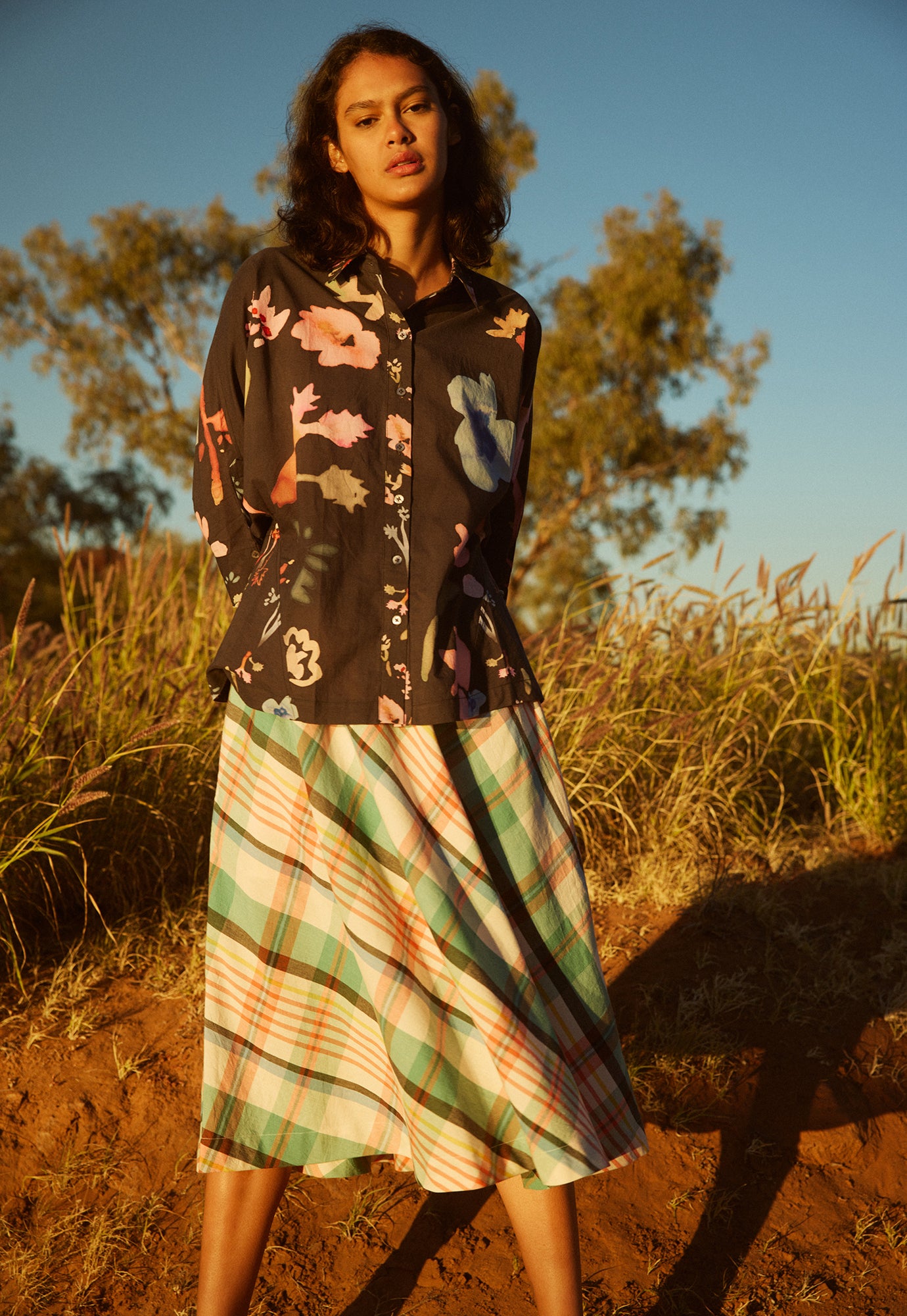 This season, our founder Emily and team travelled to Mparntwe / Alice Springs, Arrernte Country, where the vast skies, shifting light and raw beauty of the landscape became the perfect backdrop for our Iridescence collection. Shot by photographer Stephanie Cammarano at the Clay Pans just outside of town, the story of this place weaves into the garments themselves, pieces designed for travel, for ease, and for finding beauty in the everyday.