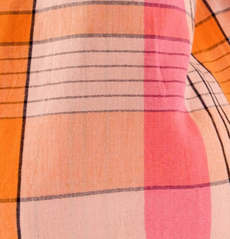 A soft, artisan handwoven cotton bag in Nancybird designed Pink Check, with orange and black plaid.