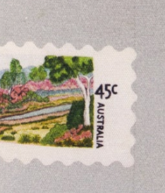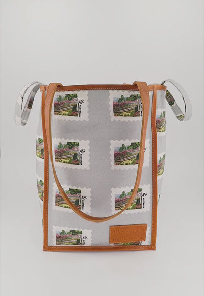 Featuring Selma Coulthard’s Postage Stamp artwork, repeated across the canvas, with leather binding and details to elevate the design.